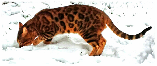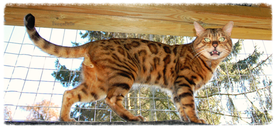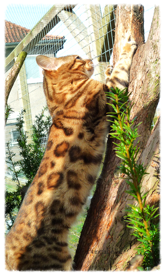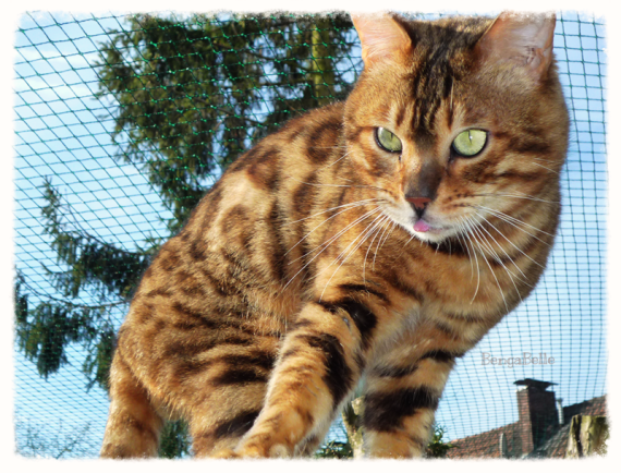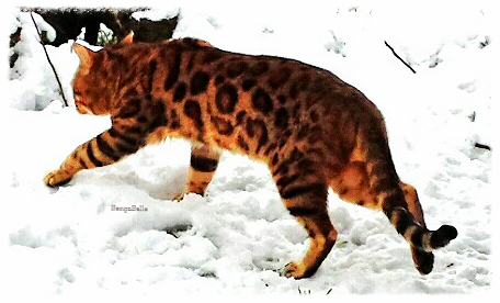 Dragon ist der Chef im Haus. Er ist zu allen Katzen und auch zu seinem Katerkumpel sehr lieb. Dragon ist ein absolut menschenbezogener Kater. Er geht beispielsweise frei mit uns im Garten spazieren und würde dabei niemals auf die Idee kommen, wegzulaufen oder sich einfach nur etwas zu entfernen. Dragons Fell hat eine wundervolle warme und kontrastreiche Farbe. Seine großen Rosetten sind dick umrandet und sehr gleichmäßig angeordnet.